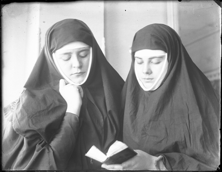 Favorite this☆ Nuns looking at prayerbook Description: View of two nuns looking at a prayerbook. Recorded in glass negative ledger: "D/Schools-Detroit School of Fine Arts." Details Resource ID: EB02g567 Subject: College and school drama, American--Michigan--Detroit Nuns--Michigan--Detroit Glass negatives Date Issued: Unknown year Format: 1 negative : glass ; 4 x 5.25 in. Member of: Burton Historical Collection Negative Number: BHC glass neg. no. 4905 Rights: Physical rights are retained by DPL. Copyright is retained in accordance with U.S. copyright laws.