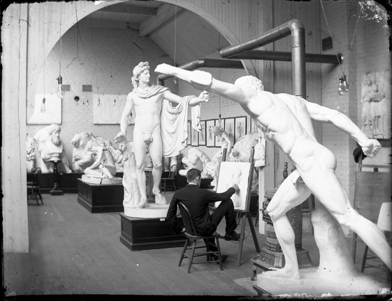 Favorite this☆ Art student sketching Description: Man sketches at easel in gallery filled with plaster reproductions of famous sculpture; man sits next to stove; drawings hang on walls. Recorded in glass negative ledger: "D/Schools-Detroit School of Fine Arts." Details Resource ID: EB02g591 Subject: Art students--Michigan--Detroit Art schools--Michigan--Detroit Glass negatives Date Issued: Unknown year Format: 1 negative : glass ; 4 x 5 in. Member of: Burton Historical Collection Negative Number: BHC glass neg. no. 4929 Rights: Physical rights are retained by DPL. Copyright is retained in accordance with U.S. copyright laws.