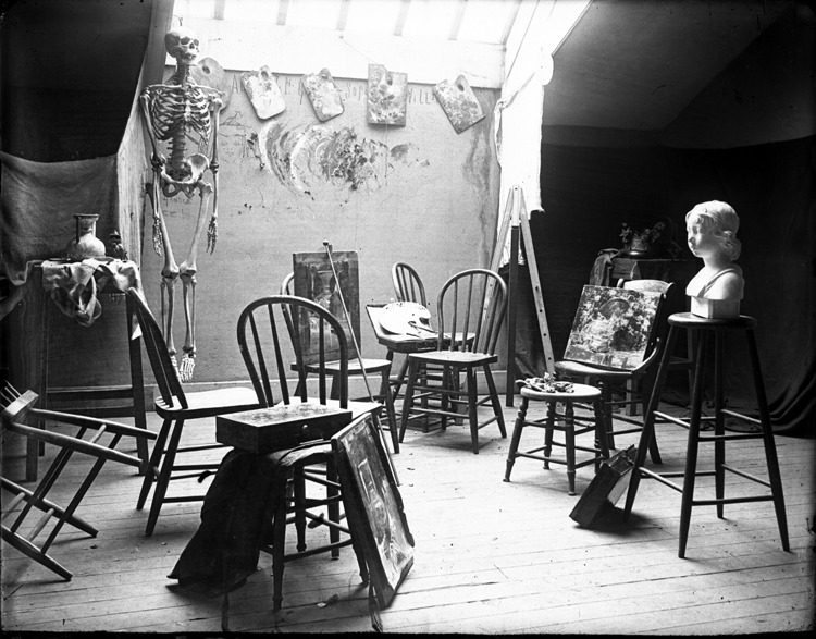 View of empty art classroom; chairs, easels, paintings, portrait bust on pedestal; palettes and skeleton hang from back wall. Recorded in glass negative ledger: "D/Schools-Detroit School of Fine Arts."