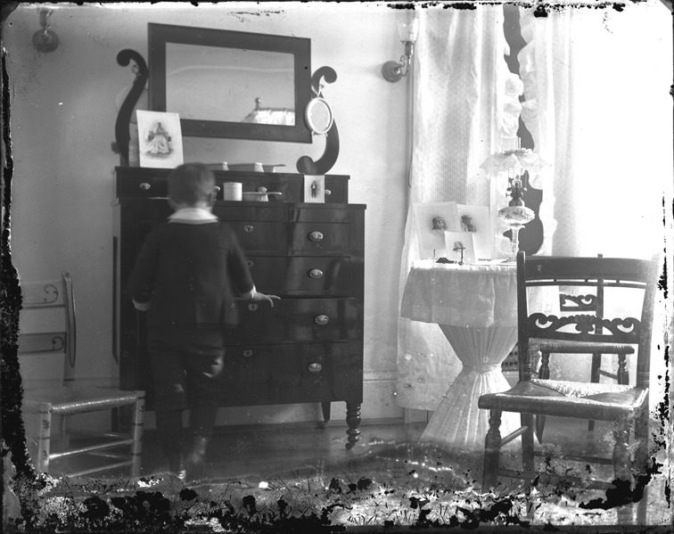View of young boy opening a drawer in a dresser or chest of drawers; mirror over dresser; ruffled curtains on windows; small round table with photographs in room. Recorded in glass negative ledger: "D/Interior decoration-Bedroom." Edges of negative are damaged.