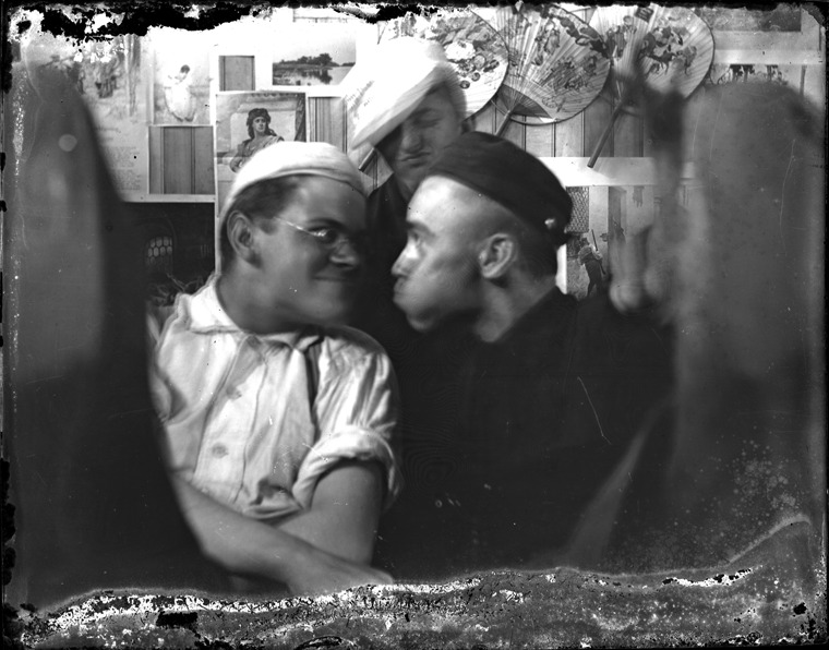 View of two men staring at each other with exaggerated facial expressions; another man stands behind them; pictures and paper fans hang on wall. Recorded in glass negative ledger: "D/Schools-Detroit School of Fine Arts." Edges of negative are damaged.