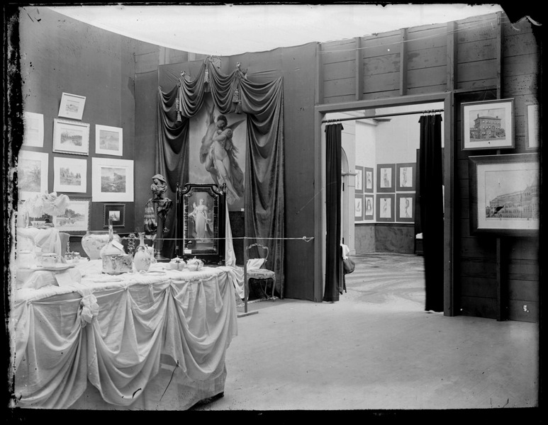 View of art gallery; oil painting by William-Adolphe Bouguereau depicting the abduction of Psyche hangs on wall; painting is surrounded by drapery; table displaying porcelain in gallery; framed drawings or watercolors hang on back wall; view into adjacent gallery. Recorded in glass negative ledger: "D/Exhibitions-Art."