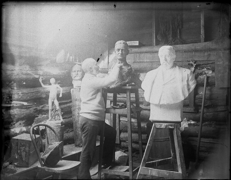 View of sculptor working in studio; several portrait busts on pedestals; studio has roughhewn log walls. Recorded in glass negative ledger: "D/Schools-Detroit School of Fine Arts."