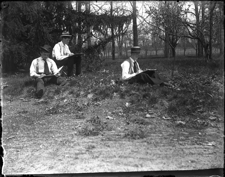 Favorite this☆ Art students sketching outdoors Description: Three young men wearing hats sketch on pads outdoors; trees in background. Recorded in glass negative ledger: "D/Schools-Detroit School of Fine Arts." Details Resource ID: EB02g660 Subject: Art students--Michigan--Detroit Glass negatives Date Issued: Unknown year Format: 1 negative : glass ; 4 x 5 in. Member of: Burton Historical Collection Negative Number: BHC glass neg. no. 5001 Rights: Physical rights are retained by DPL. Copyright is retained in accordance with U.S. copyright laws.