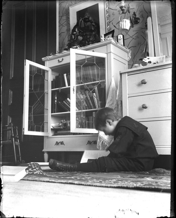 Favorite this☆ Boy reading in bedroom Description: View of boy seated on floor of bedroom, reading; glass doors of bookcase are open; dresser with mirror adjacent to bookcase. Recorded in glass negative ledger: "D/Interior decoration-Bedroom." Details Resource ID: EB02g669 Subject: Bedrooms--Michigan--Detroit Boys--Michigan--Detroit Bookcases--Michigan--Detroit Glass negatives Date Issued: Unknown year Format: 1 negative : glass ; 5 x 4 in. Member of: Burton Historical Collection Negative Number: BHC glass neg. no. 5010 Rights: Physical rights are retained by DPL. Copyright is retained in accordance with U.S. copyright laws.