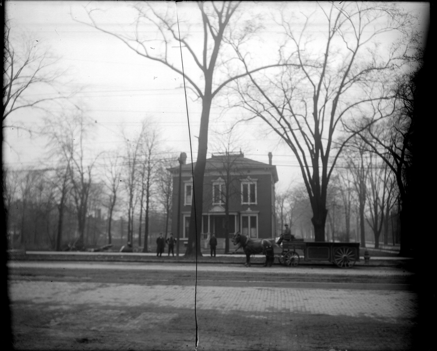 Several men pose in front of Italianate style brick house on unidentified street; horse-drawn wagon in front of house. Recorded in glass negative ledger: "D/Historic houses." Negative is broken in center.