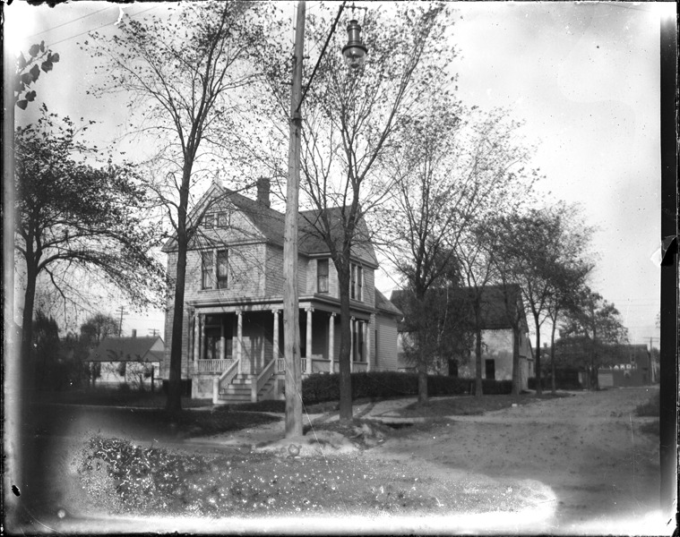Favorite this☆ House on Thirteenth Street Description: View of front-gabled Queen Anne style house on corner; covered entry porch supported by Ionic columns. Recorded in glass negative ledger: "D/Streets-Thirteenth, 1084 13th St., corner of Bryant." Details Resource ID: EB02g708 Subject: Wooden-frame houses--Michigan--Detroit Architecture, Queen Anne--Michigan--Detroit Glass negatives Date Issued: Unknown year Format: 1 negative : glass ; 4 x 5 in. Member of: Burton Historical Collection Negative Number: BHC glass neg. no. 5054 Rights: Physical rights are retained by DPL. Copyright is retained in accordance with U.S. copyright laws.