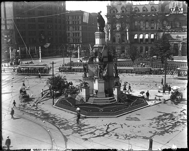 View of Soldiers' and Sailors' monument decorated with American flags for Detroit's bicentennial; decorated Detroit City Hall in background. Men remove potted ferns from wagon and place around monument. Recorded in glass negative ledger: "D/Monuments-Soldiers' and Sailors'."