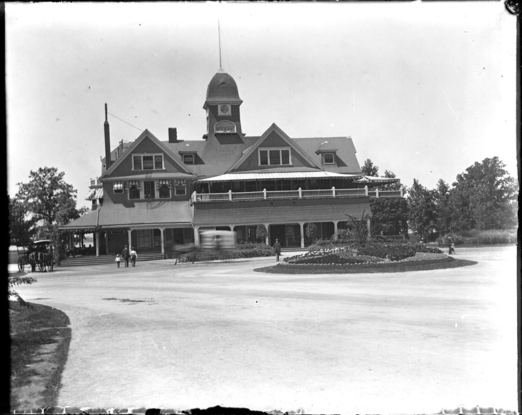 View of Belle Isle Casino; Shingle style building with cupola and canopied verandas; clock on cupola. Recorded in glass negative ledger: "D/Parks-Belle Isle-Casino."