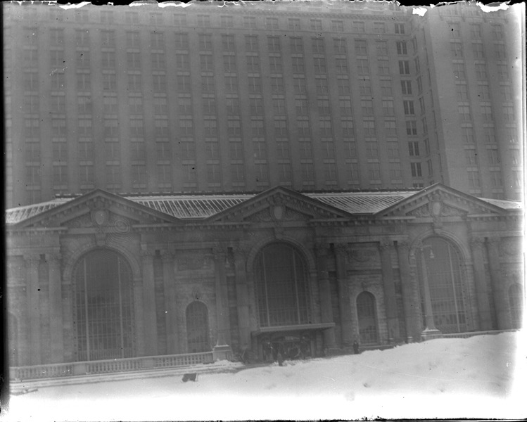 Partial view of Michigan Central Railroad depot; waiting room section is low building with rounded arch windows, columns and pediments; multistory building in background. Recorded in glass negative ledger: "D/Railroads-M.C.R.R. depot, 1913, exterior."
