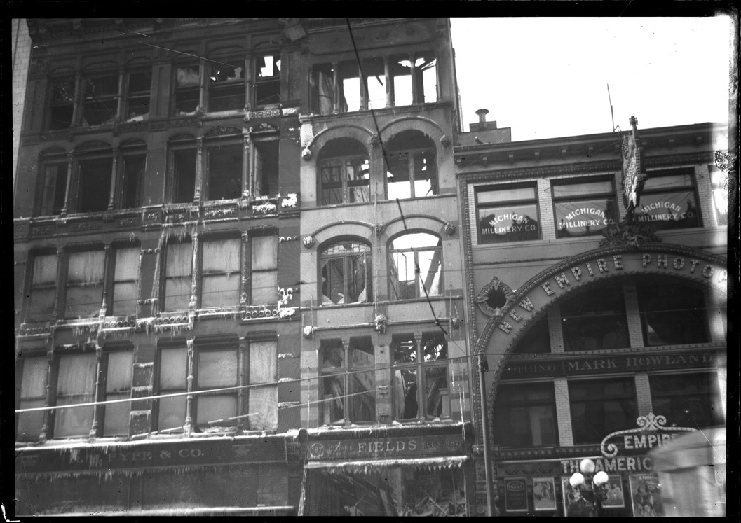 Favorite this☆ Aftermath of fire at R.H. Fyfe and Fields stores Description: View of remains of Fields and R.H. Fyfe stores after fire; buildings have broken windows; icicles hang from building facade. Recorded in glass negative ledger: "D/Fires-Fields cloaks." Details Resource ID: EB02g743 Subject: Fires--Michigan--Detroit Commercial buildings--Fires and fire prevention Glass negatives Date Issued: Unknown year Format: 1 negative : glass ; 5 x 7 in. Member of: Burton Historical Collection Negative Number: BHC glass neg. no. 6155 Rights: Physical rights are retained by DPL. Copyright is retained in accordance with U.S. copyright laws.