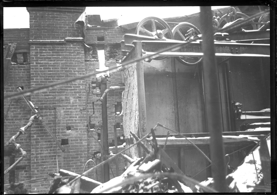 View of ruined interior of building after fire; exposed brick walls and pipes. Recorded in glass negative ledger: "D/Fires-Fields cloaks."