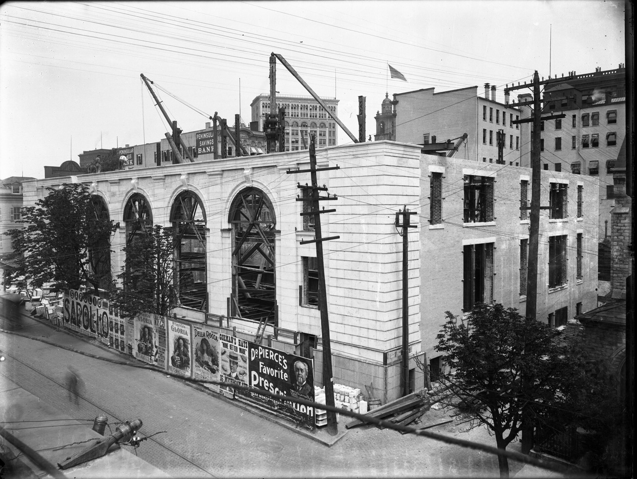 View of construction of State Savings Bank; stone facade has rounded arch windows; steel beams and girders visible inside building; cranes visible behind roof; temporary wooden fence plastered with advertisements and handbills in front of building. Recorded in glass negative ledger: "D/Banks-State Savings Bank."