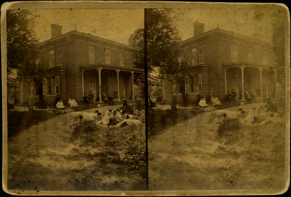 Beige mount. Two-story brick house. View of front and side of home, two women sitting on the side of home, five men sitting on porch, dirt road leading to home, one man and one boy sitting on opposite side of dirt road with several dogs. Handwritten on back: "Suburban residence of Dr. Saunders, Old 585 Field, about 1875, later 2541 Field, Moses Field residence."