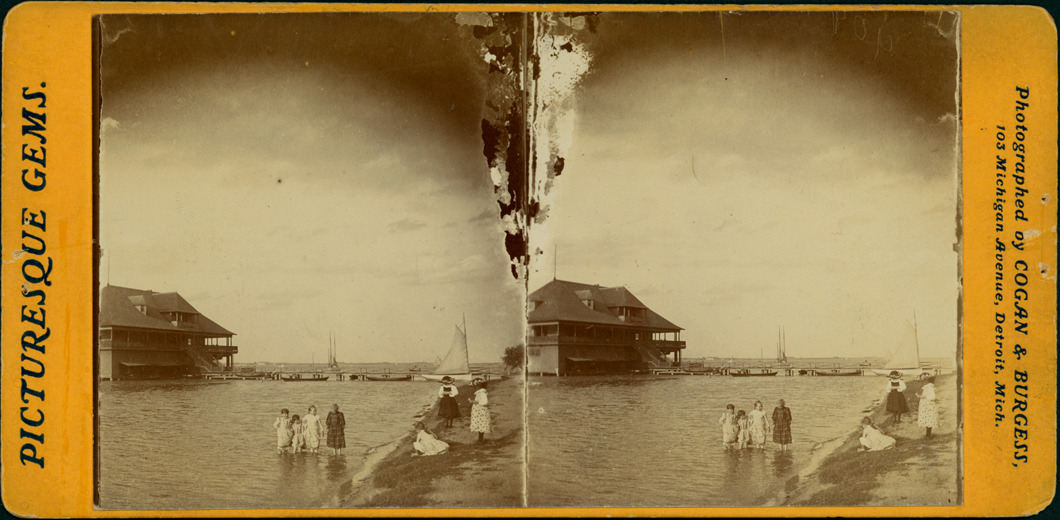 Four girls playing in the water and three girls playing on land at Belle Isle, boathouse seen in the distance. Printed on front: "Picturesque gems, photographed by Cogan & Burgess, 103 Michigan Avenue, Detroit Mich."