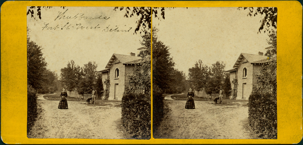 Gold mount. Woman standing in the middle of dirt road leading to home, man standing next to the house with dog. Handwritten on front: "Hubbards, Fort St. West, Detroit." Handwritten on back: "Hubbard." Printed on back: "Photographic sketches in and about the city of Detroit, consisting of street and marine views, public buildings, churches, monumental, and other objects of interest, photographed and published by Jex Bardwell."