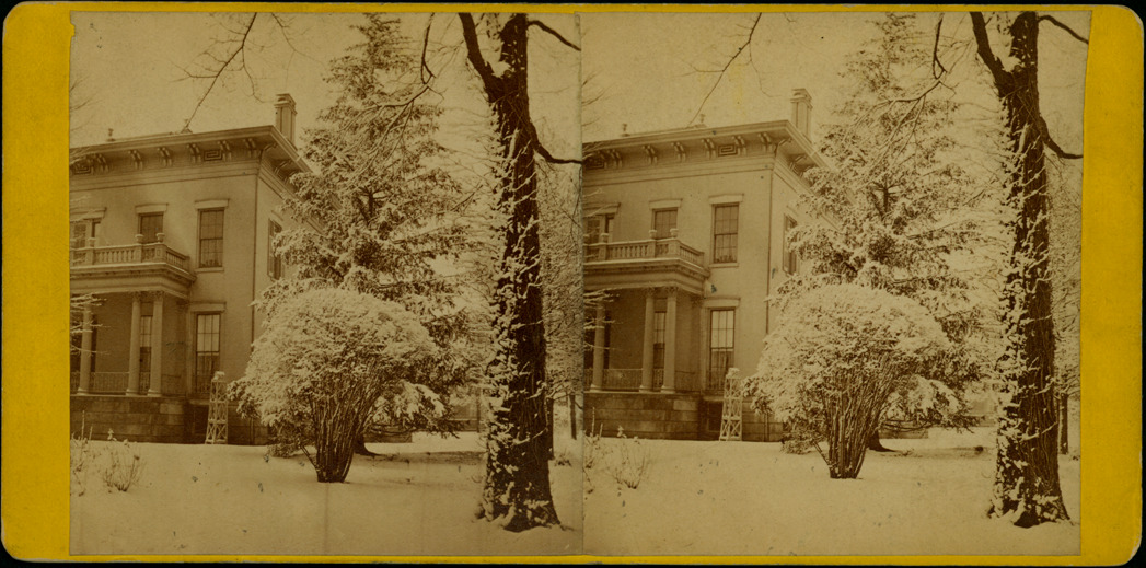 Gold mount. Two-story home in the winter, snow covering the home, trees and ground near home. Handwritten on back: "De Garmo Jones residence, Fort St. W., 1880." Printed on back: "Photographic sketches in and about the city of Detroit, consisting of street and marine views, public buildings, churches, monumental, and other objects of interest, photographed and published Jex Bardwell."