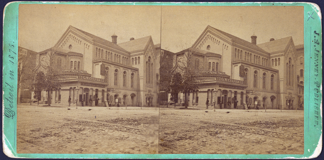 Green mount. First Baptist Church, next door signs read "Detroit Theatre" and "G.W.Culver." Printed on card front: "Detroit in 1875, J.A.Jenney, publisher." Written on card back: "N.W. cor. Fort-Griswold, 2nd brick Baptist church, corner Fort and Griswold, afterwards used as a theatre." Printed on card back: "Detroit scenery no. 30, Hough's Theatre, photographed and published by J.A. Jenney, No. 129 Jefferson Ave."