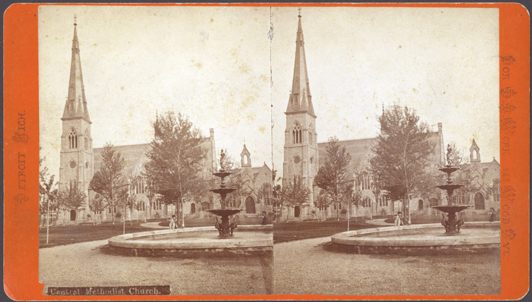 Orange mount. Central Methodist Church, fountain in front. Written on card front: "Central Methodist Church, Detroit, Mich., for D.P. Work, 148 Wood Ave."
