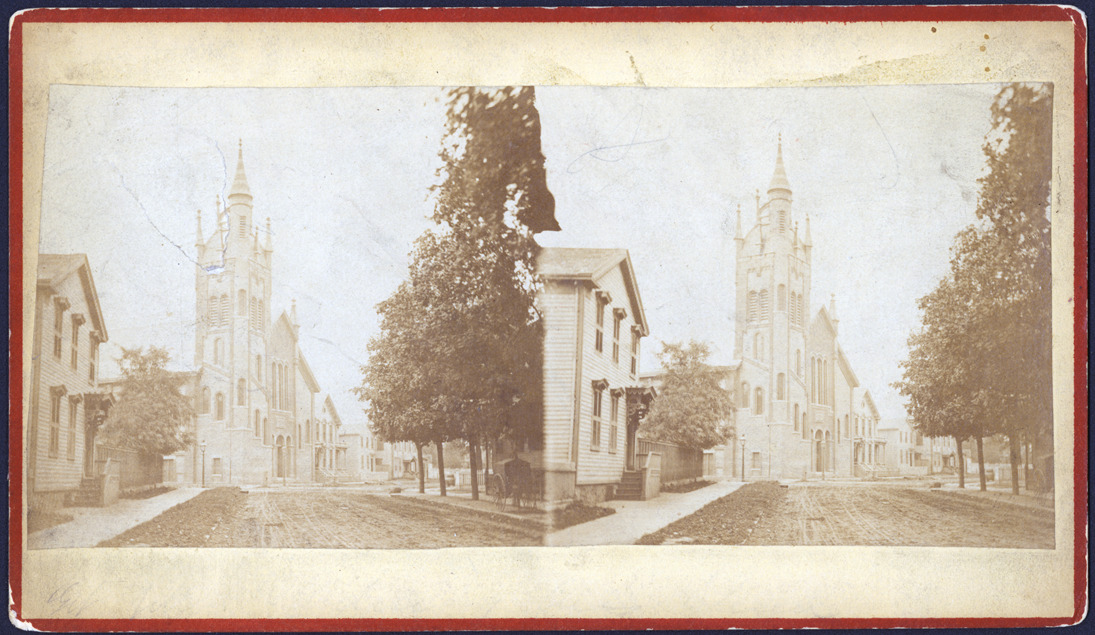 Favorite this☆ Central or Scotch Presbyterian Church Description: Cream mount with red border. Central or Scotch Presbyterian Church at corner of Bates and Farmer, built in 1871, dirt street and wooden Victorian houses in view. Written on card back: "Scotch Presbyterian Church, n.w. cor. Farmer and Bates, 1872." Details Resource ID: EB02h039 Subject: Presbyterian church buildings--Michigan--Detroit Dwellings--Michigan--Detroit Architecture, Victorian--Michigan--Detroit Stereographs Date Issued: 1872 Format: 1 photoprint on stereocard ; 4.25 x 7.25 in. Member of: Burton Historical Collection Filing Location: D/Churches-Presbyterian Scotch (Central) Negative Number: BHC glass neg. no. 1915 Rights: Physical rights are retained by DPL. Copyright is retained in accordance with U.S. copyright laws.