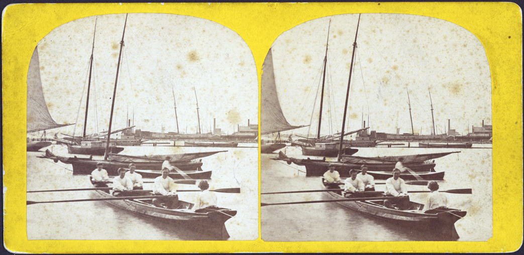 Goldenrod mount, dome-topped. Four men and one woman, back to the camera, in row boat, moored boats and shoreline in background. Handwritten on stereocard back: "Riverfront, ca. 1900, Detroit rowing." Label pasted on card back reads: "Stereoscopic gems of the city of Detroit and vicinity, photographed by Jex Bardwell."