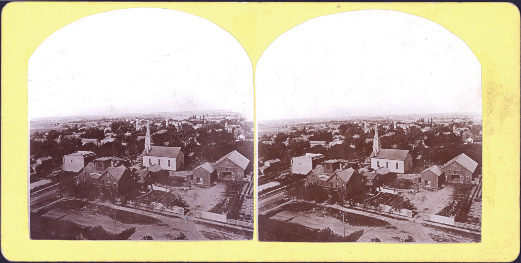 Yellow mount, dome-topped. Bird's-eye view of St. Johns showing church, barn and houses.