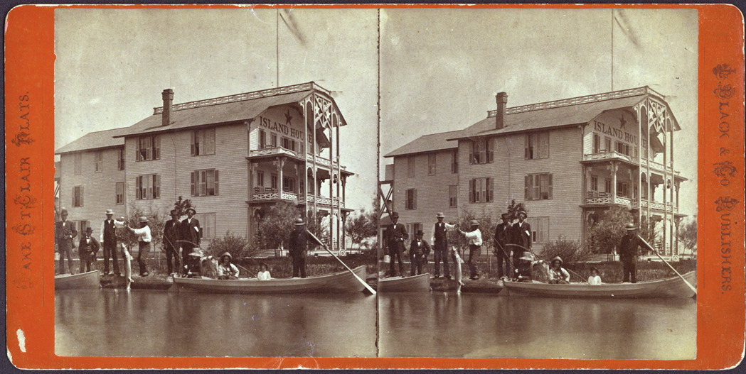 Favorite this☆ Man with fish in front of Island House Description: Orange mount. Two rowboats in front of Island Hotel, two men holding large fish. Printed on front of stereocard: "Lake St. Clair Flats, L. Black & Co. publishers." Handwritten on stereocard back: "Star Island, 1880." Details Resource ID: EB02h073 Subject: Hotels--Michigan--Saint Clair County Canals--Michigan--Saint Clair County Fish--Michigan--Saint Clair County Photographers--Michigan--Detroit Stereographs Publisher: L. Black & Co. Publishers Date Issued: 1880 Format: 1 photoprint on stereocard ; 3.5 x 7 in. Member of: Burton Historical Collection Filing Location: M/Localities-St. Clair Flats Note (Content): Silas Farmer Collection Rights: Physical rights are retained by DPL. Copyright is retained in accordance with U.S. copyright laws.