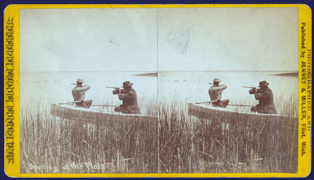 Gold mount. Two men in rowboat amid rushes, both are pointing rifles toward birds on the water. Printed on front of stereocard: "St. Clair River Scenes, photographed and published by Jenney & Miller, Flint, Mich." Handwritten on stereocard back: "Dr. Field and Capt. Watt."