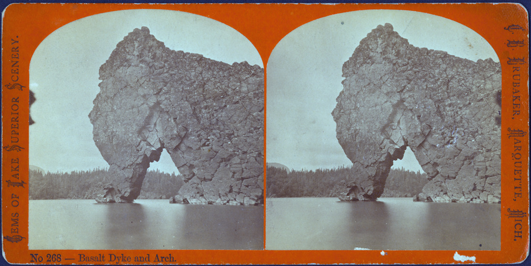 Favorite this☆ Basalt Dyke and Arch on Lake Superior Description: Orange mount, dome-topped. Large rock formation of basalt with arched opening on Lake Superior. Printed on front of stereocard: "No. 268-Basalt Dyke and Arch, Gems of Lake Superior scenery, C.B. Brubaker, Marquette, Mich." Details Resource ID: EB02h100 Creator: Brubaker, C.B. Subject: Basalt--Superior, Lake Arches--Superior, Lake Rocks--Superior, Lake Photographers--Michigan--Marquette Stereographs Date Issued: Unknown year Format: 1 photoprint on stereocard ; 3.5 x 7 in. Member of: Burton Historical Collection Filing Location: M/Rocks Rights: Physical rights are retained by DPL. Copyright is retained in accordance with U.S. copyright laws.