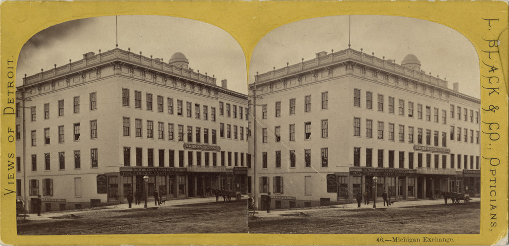 Yellow domed mount. View of Michigan Exchange, some men, a horse and cart in front. Printed on front of stereocard: "Views of Detroit, 46-Michigan Exchange, L. Black & Co., opticians." Handwritten on stereocard back: "Cor. Jefferson & Shelby, s.w. corner."