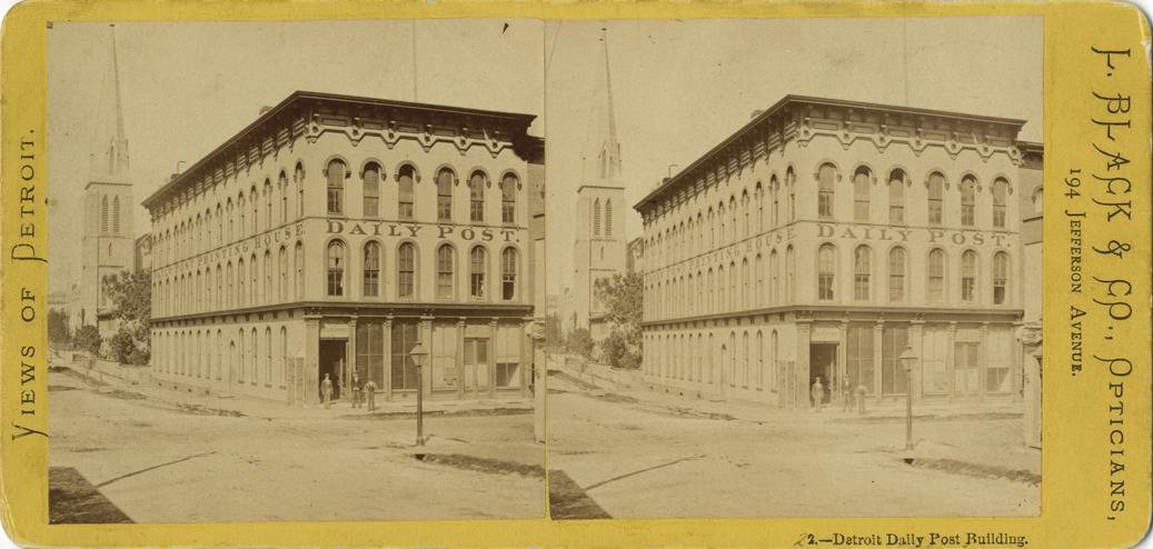 Yellow mount. View of Detroit Daily Post Building, men in doorway, church visible down the street. Printed on front of stereocard: "Views of Detroit, 22-Detroit Daily Post Building, L. Black & Co., opticians, 194 Jefferson Avenue." Handwritten on stereocard back: "N.E. cor. Larned & Shelby."