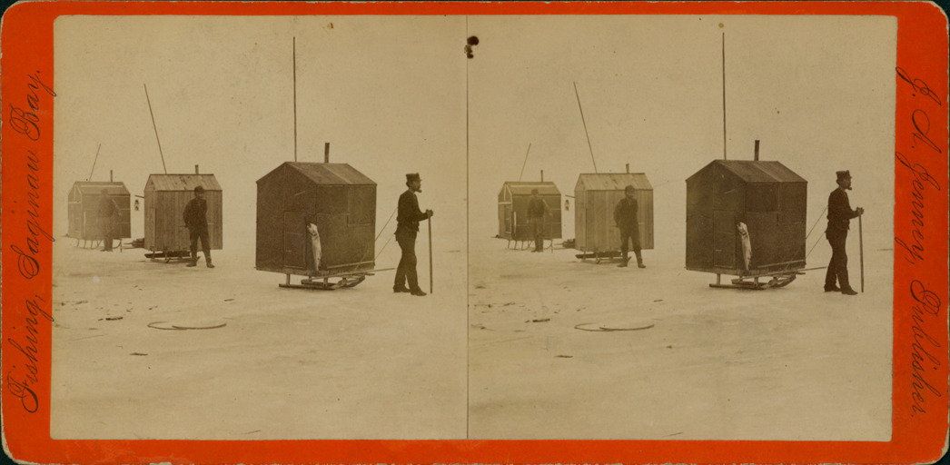 Orange mount. Three men each pulling a fishing shanty on a sled, large fish hanging on side of one shanty. Printed on front: "Fishing Saginaw Bay, J.A. Jenney publisher." Printed on back: "It is estimated that there are three thousand men engaged in this business, during the winter. The average catch of each man, being about 40 lbs. a per day. Value of fish, about seven hundred thousand dollars. Photographed by J.A. Jenney, Detroit, no.5 Fishermen moving [from series] Winter fishing on Saginaw Bay."