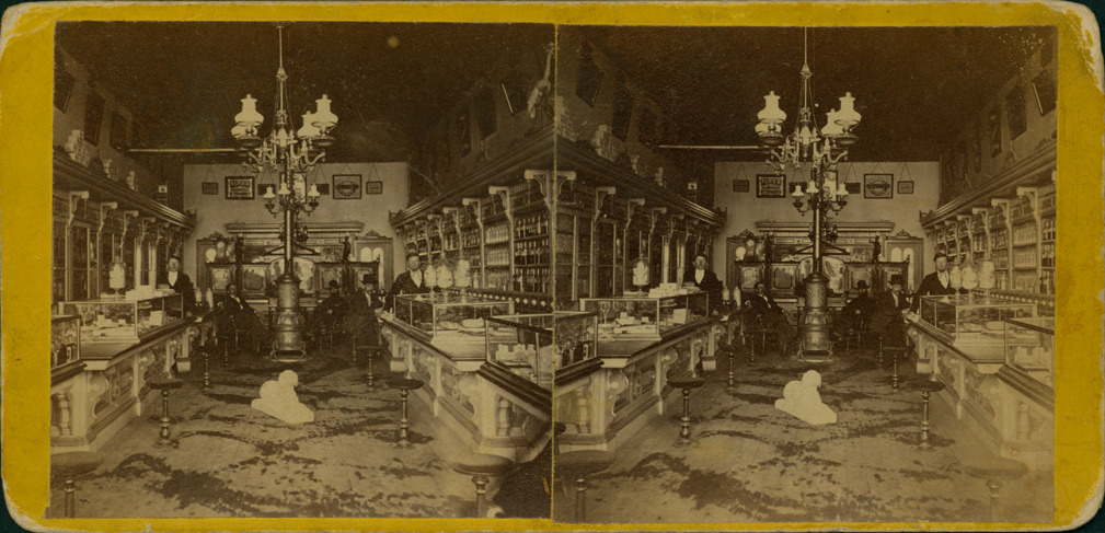 Goldenrod mount. Interior view down main isle toward back of drugstore with employees and customers in background and counters with stools on either side. Printed on stereocard back: "Views of Greenville and vicinity, published and for sale by H.S. Clark, Greenville, Mich." Handwritten on back: "Conover's Drug Store, Lewis block, Greenville, inside view, July, 1843, from MS Sherwood, W.C."