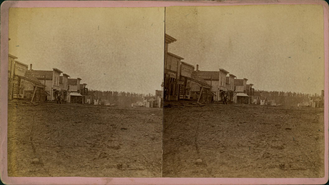 Lavender mount. View of businesses on one side of unknown street in Harrison, Michigan. Printed on stereocard back: "C.E. Baldwin, Flint, Mich." Handwritten on back: "40."
