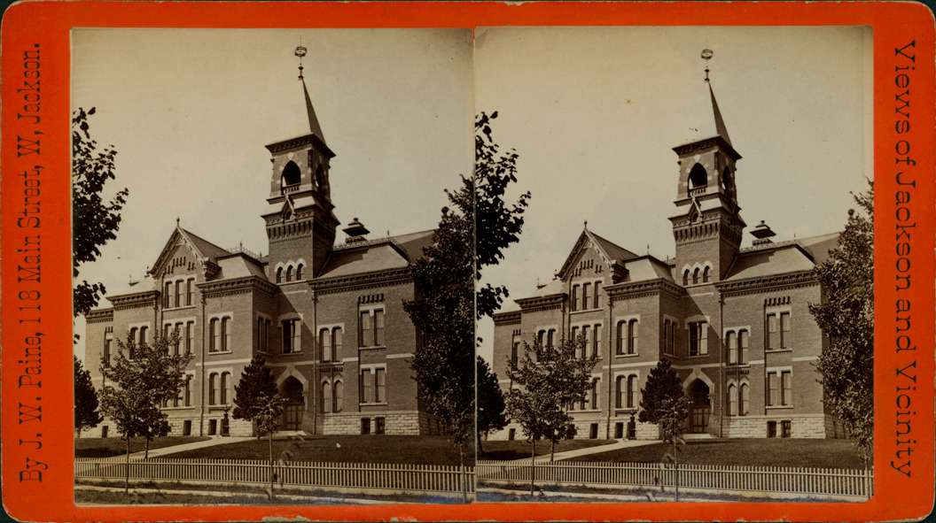 Orange mount. Exterior view of school building in Jackson. Printed on front of stereocard: "Views of Jackson and vicinity, by J.W. Paine, 118 Main Street, W., Jackson." Handwritten on stereocard back: "West-side school house, Jackson, Mich., Aug. 4, 1881."
