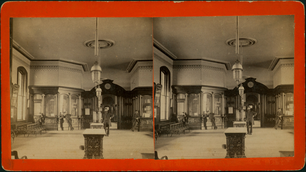 Orange mount. Interior view of the train depot in Jackson, Michigan with three men, one in uniform, in background. Handwritten on stereocard back: "Inside of central depot, Jackson, Mich, Aug. 4, 1881, TES."