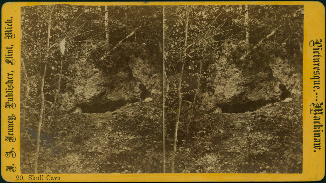 Goldenrod mount. View of Skull cave entrance surrounded by trees. Printed on front of stereocard: "Picturesque Mackinaw, 20. Skull Cave, J.A. Jenney, publisher, Flint, Mich."