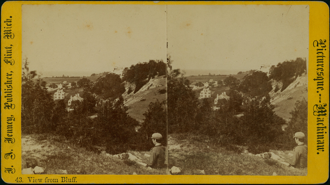Goldenrod mount. Boy sitting on hillside overlooking Mackinac Island. Printed on front of stereocard: "Picturesque Mackinaw, 43. View from bluff, J.A. Jenney, publisher, Flint, Mich."
