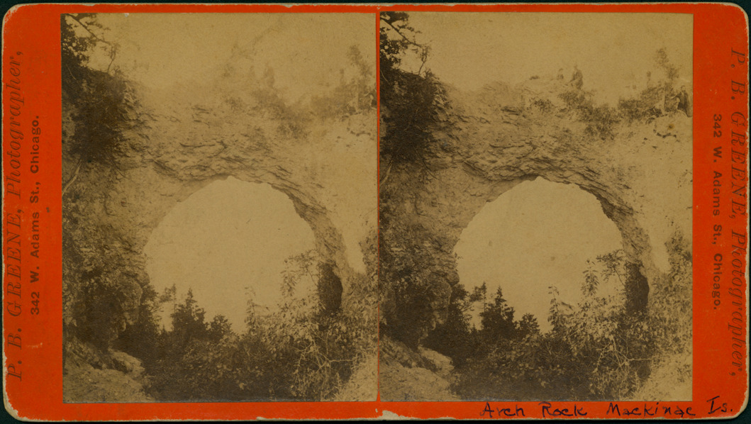 Orange mount. View of Arch Rock on Mackinac Island. Printed on front of stereocard: "P.B. Greene, photographer, 342 W. Adams St., Chicago." Handwritten on front: "Arch rock, Mackinac Is." Printed on stereocard back: "Views of the national park Mackinac Island, Michigan, stereographs, 203. Arch Rock, P.B. Greene, photographer, 342 West Adams St., Chicago."