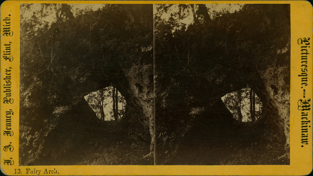 Goldenrod mount. View of Fairy's Arch, trees can be seen through the arch. Printed on front of stereocard: "Picturesque Mackinaw, 13. Fairy's Arch, J.A. Jenney, publisher, Flint, Mich."