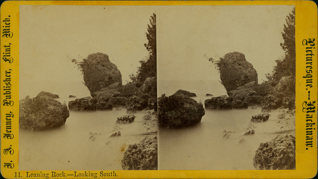 Goldenrod mount. View of Leaning rock on Mackinac Island with other large rocks in and near the water. Printed on front of stereocard: "Picturesque Mackinaw, 11. Leaning rock, looking south, J.A. Jenney, publisher, Flint, Mich."