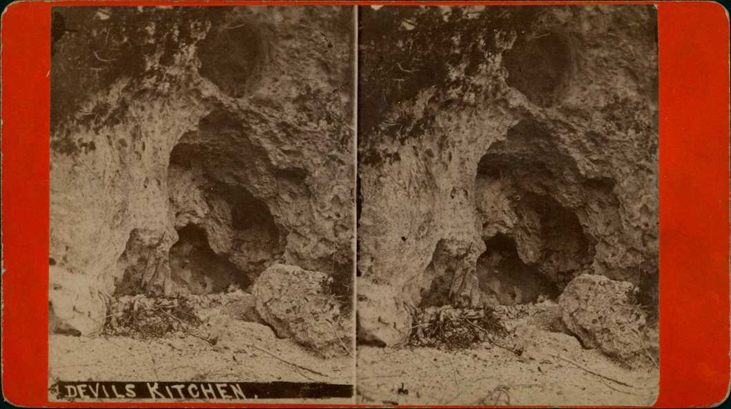 Favorite this☆ Devil's Kitchen on Mackinac Island Description: Orange mount. View of Devil's Kitchen rock. Handwritten on front of stereocard: "Devil's Kitchen." Details Resource ID: EB02m109 Subject: Rocks--Michigan--Mackinac Island Caves--Michigan--Mackinac Island Stereographs Date Issued: Unknown year Format: 1 photoprint on stereocard ; 4 x 7 in. Member of: Burton Historical Collection Filing Location: M/Localities-Mackinac Island Rights: Physical rights are retained by DPL. Copyright is retained in accordance with U.S. copyright laws.