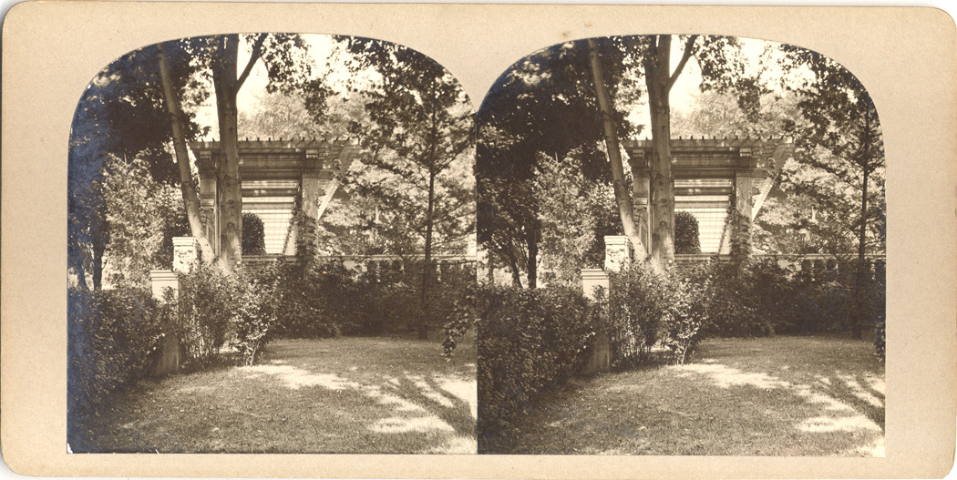 Gray mount. Dome topped. View of garden with unidentified building in background.