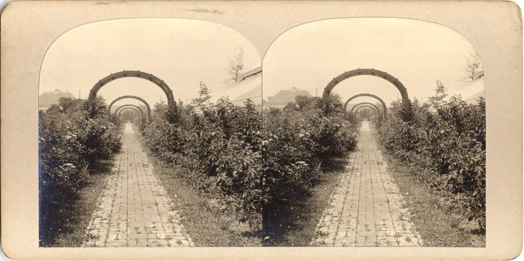 Gray mount. Dome topped. View down garden walk with trees and bushes on either side and trellises in background.