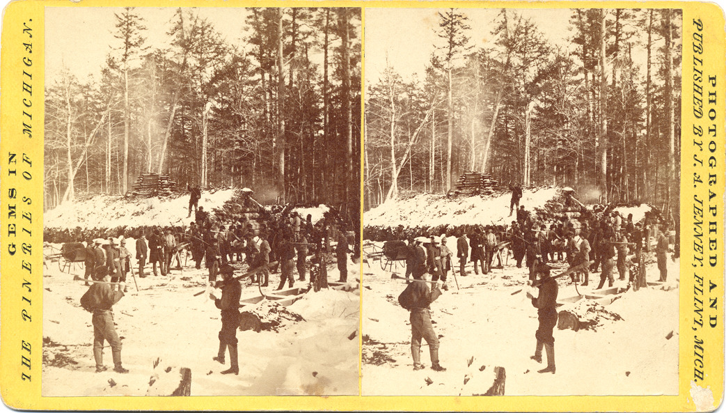 Favorite this☆ Group of loggers in front of cabin Description: Goldenrod mount. Large group of loggers, some holding axes stand in foreground of image, cabin in background. Printed on front of stereocard: "Gems in the pineries of Michigan, photographed and published by J.A. Jenney, Flint, Mich." Details Resource ID: EB02m240 Creator: Jenney, J.A. (James A.) Subject: Logging--Michigan Log cabins--Michigan Loggers--Michigan Photographers--Michigan--Flint Stereographs Publisher: J.A. Jenney Date Issued: Unknown year Format: 1 photoprint on stereocard ; 4 x 7 in. Member of: Burton Historical Collection Filing Location: M/Lumber industry & trade Rights: Physical rights are retained by DPL. Copyright is retained in accordance with U.S. copyright laws.