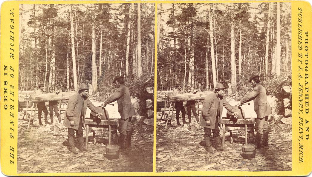 Favorite this☆ Loggers sharpening ax Description: Goldenrod mount. One man turns wheel while another sharpens ax, two other loggers in background. Printed on front of stereocard: "Gems in the pineries of Michigan, photographed and published by J.A. Jenney, Flint, Mich." Details Resource ID: EB02m241 Creator: Jenney, J.A. (James A.) Subject: Loggers--Michigan Logging--Equipment and supplies Lumber camps--Michigan Photographers--Michigan--Flint Stereographs Publisher: J.A. Jenney Date Issued: Unknown year Format: 1 photoprint on stereocard ; 4 x 7 in. Member of: Burton Historical Collection Filing Location: M/Lumber industry & trade Rights: Physical rights are retained by DPL. Copyright is retained in accordance with U.S. copyright laws.