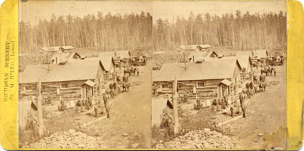 Goldenrod mount. View of a lumber camp with men and horses in front of buildings. Printed on front of stereocard: "Michigan scenery by M. Hiler, Lowell." Printed on stereocard back: "Views of the great lumbering business and other industries of Michigan as photographed by Milo Hiler." Handwritten on back: "Near Blanchard."