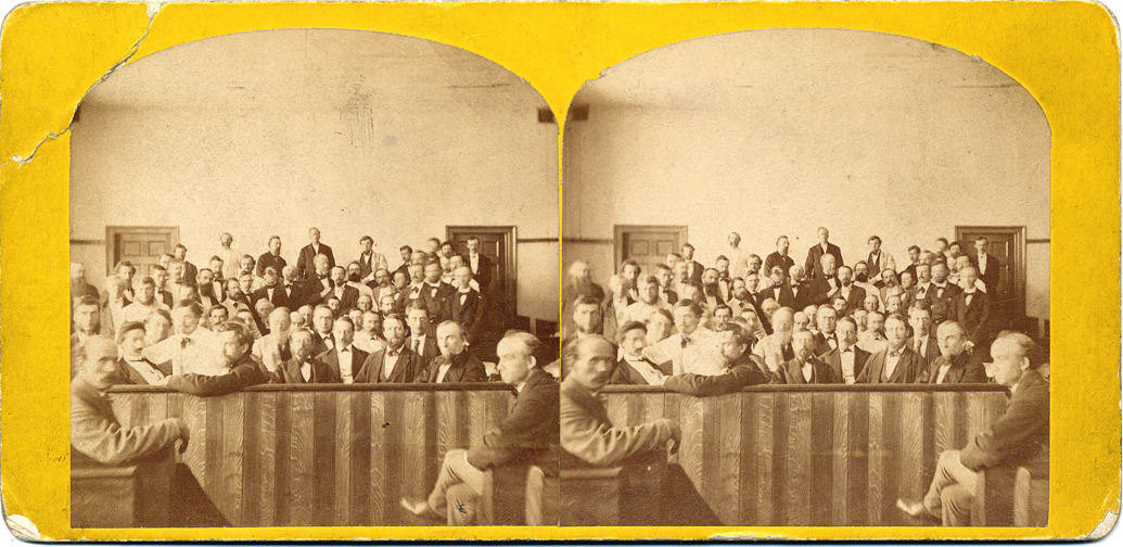 Goldenrod mount. Dome topped. Portrait of a large group of men, most of them sitting behind the bar at the old Wayne County Circuit Court building. Printed on stereocard back: "Out of the old house into the new, the last sitting of the Wayne County Circuit Court in the old house, May 31st, 1871, photographed by Jex Bardwell."