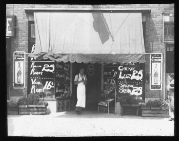 Favorite this☆ Butcher shop in Center Line, Michigan Description: Man stands under the awning at the entrance of a butcher shop at 8165 Lillian Street in Center Line, Michigan. Recorded in lantern slide ledger: "M/Loc.-Centerline." Details Resource ID: EB02m287 Subject: Meat industry and trade--Michigan--Center Line Butchers--Michigan--Center Line Lantern slides Date Issued: Unknown year Format: 1 transparency : glass ; 3 x 4 in. Member of: Burton Historical Collection Negative Number: BHC lantern slide no. 1133 Rights: Physical rights are retained by DPL. Copyright is retained in accordance with U.S. copyright laws.