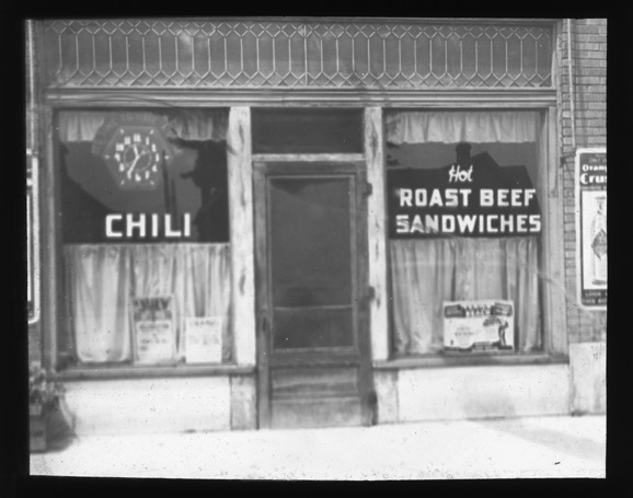 View of the front of a diner in Center Line, Michigan, printed in widow, "Chili, Hot roast beef sandwiches." Recorded in lantern slide ledger: "M/Loc.-Centerline."